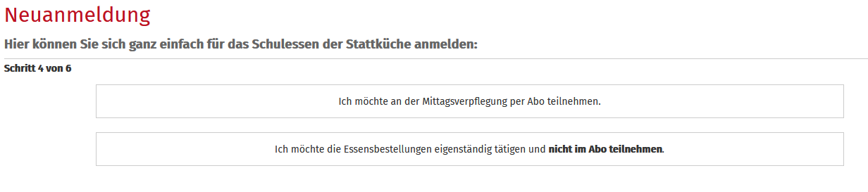 11) Wählen Sie nun aus, ob Ihr Kind im Abo am Mittagessen teilnehmen soll, oder ob Sie die Essensbestellung eigenständig tätigen möchten.