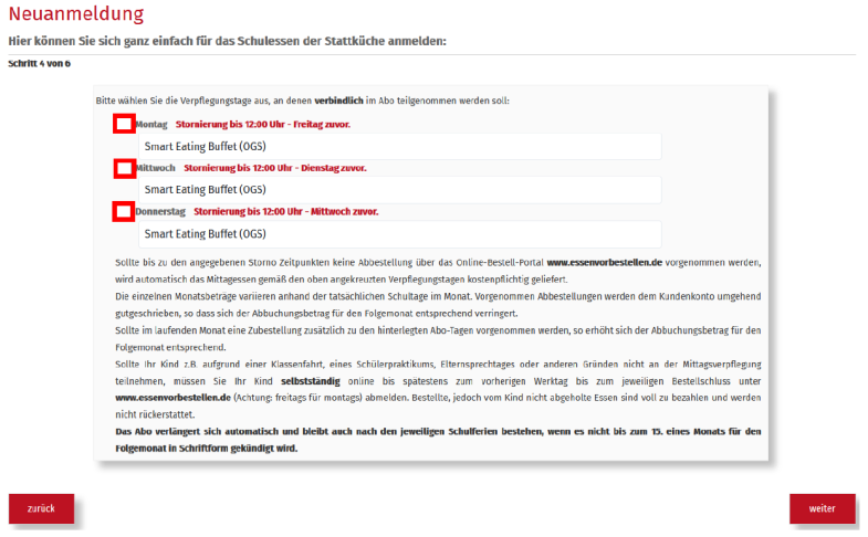 12) Wählen Sie nun die Essenstage Ihres Kindes aus (nur bei Anmeldung zum Abo notwendig / Essenstage/ Essenspreis sind hier beispielhaft und können variieren).