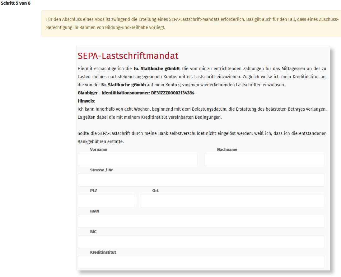 13) Die Monatsbeiträge werden im Abo monatlich per SEPA Lastschriftverfahren eingezogen, daher ist es zwingend erforderlich, dass der Stattküche ein SEPA-Lastschriftmandat erteilt wird.