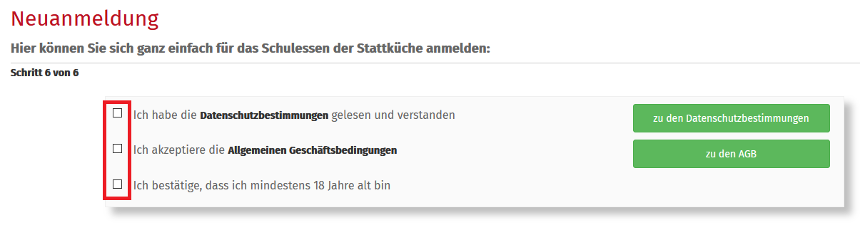 14) Um die Anmeldung abschließen zu können, bestätigen Sie bitte die Datenschutzbestimmungen, AGB und das Sie mindestens 18 Jahre alt sind.