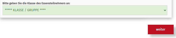5) Bitte wählen Sie die Klasse bzw. Gruppe des Kindes aus und bestätigen Sie Ihre Eingabe durch Klick auf den Button „Weiter“. Sollten Sie Ihr Kind vor den Sommerferien bei uns registrieren, wählen Sie bitte die Klasse „neuer 5er im SJ 25/26“ aus.