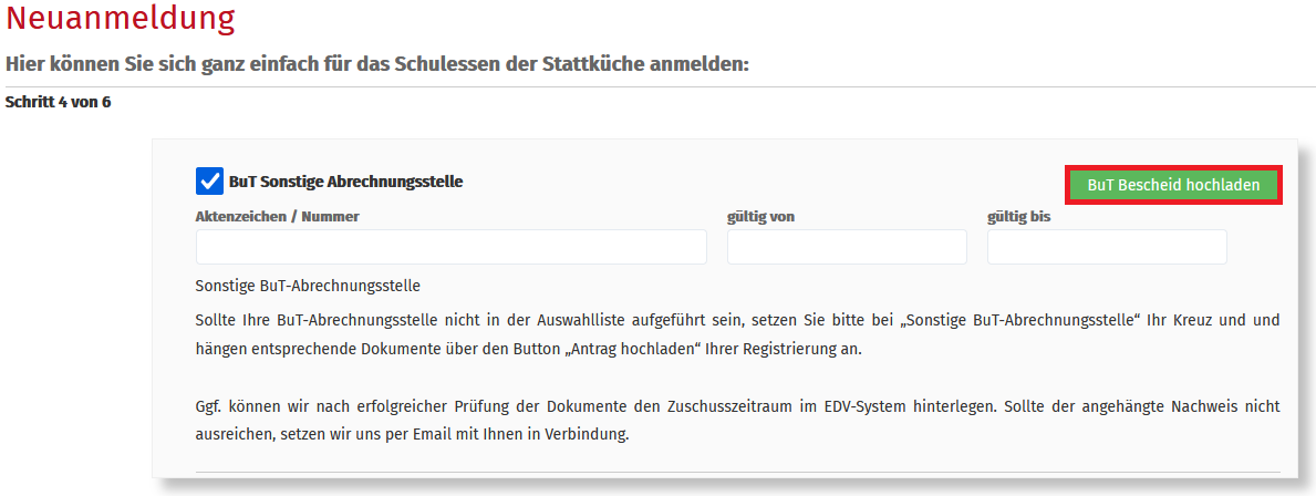 10) Falls Sie einen Zuschuss für das Mittagessen erhalten, laden Sie Ihren aktuellen BuT-Bescheid über den grünen Button „BuT Bescheid hochladen“ hoch.