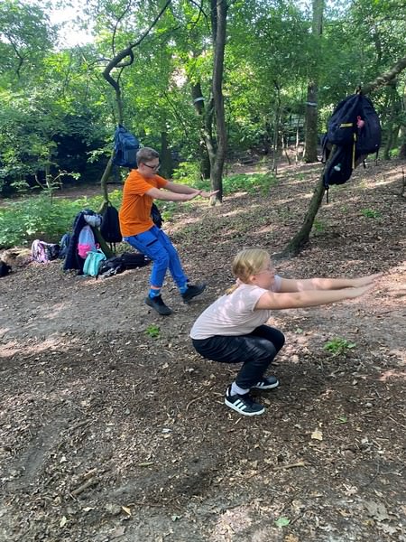 Zum Glück spielte das Wetter mit und so hatten die Jugendlichen viel Spaß an den verschiedenen Projekttagen, die unter dem Motto „Bewegung“, „Soziales Miteinander“ „Umwelt“ und „Entspannung“ standen. Abwechslungsreiche Bewegungsspiele, die den Teamgeist förderten, begeisterten die Teilnehmer. So musste zum Beispiel ein Esslöffel mit Wasser über den unebenen Waldboden transportiert und die Flüssigkeit in einen Becher gefüllt werden und das Team mit der größeren Menge gewann. Bei der „Flussüberquerung“ sollte die ganze Klasse trockenen Fußes über „Steine“ einen „Fluss“ überqueren. Leider gab es nicht genug Steine, um trocken ans andere „Ufer“ zu kommen und so musste die Gruppe zusammenarbeiten und eine Strategie entwickeln, wie alle es schafften und niemand zurückblieb.